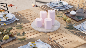 For et roligt helhedsindtryk kan du samle lysene på et fad og variere højderne, mens farverne holdes i samme palette.