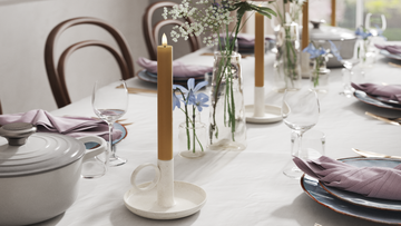 Kronelys giver højde i borddækningen. Stil flere på række for et gennemført udtryk med ro og rytme.